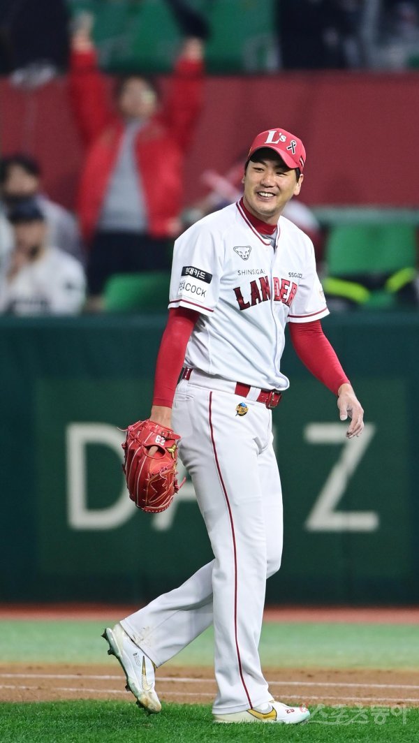 1일 인천 SSG랜더스필드에서 열린 ‘2022 신한은행 SOL KBO리그’ 한국시리즈 1차전 SSG 랜더스와 키움 히어로즈의 경기에서 1회초 수비를 무실점으로 막은 SSG 김광현이 동료들을 보며 웃고 있다.
