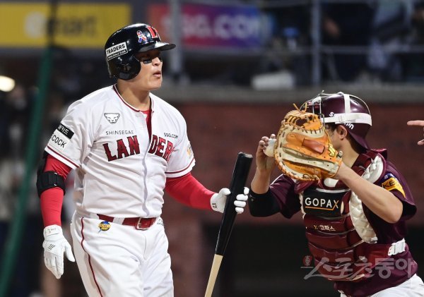 1일 인천 SSG랜더스필드에서 열린 ‘2022 신한은행 SOL KBO리그’ 한국시리즈 1차전 SSG 랜더스와 키움 히어로즈의 경기에서 1회말 무사 SSG 추신수가 삼진 아웃을 당한 후 아쉬워하고 있다.