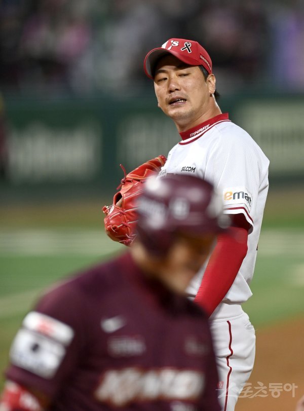 1일 인천 SSG랜더스필드에서 ‘2022 신한은행 MY CAR KBO리그’ 한국시리즈 1차전 키움 히어로즈와 SSG 랜더스 경기가 열렸다. 5회초 2사 1,3루 SSG 선발 김광현이 폭투로 동점을 허용한 후 아쉬워하고 있다.