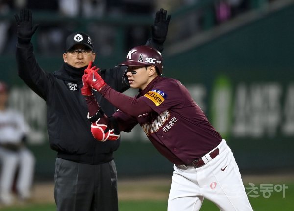 1일 인천 SSG랜더스필드에서 ‘2022 신한은행 MY CAR KBO리그’ 한국시리즈 1차전 키움 히어로즈와 SSG 랜더스 경기가 열렸다. 5회초 2사 1루 키움 송성문이 우전 안타를 SSG 실책과 공이 홈으로 송구되는 사이 3루까지 달려 세이프 된 후 기뻐하고 있다.