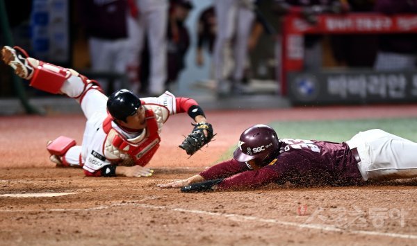 1일 인천 SSG 랜더스필드에서 ‘2022 신한은행 SOL KBO리그’ SSG 랜더스와 키움 히어로즈의 한국시리즈 1차전 경기가 열렸다. 5회초 2사 1루에서 안타 때 키움 김휘집이 상대 실책으로 득점을 올리고 있다.