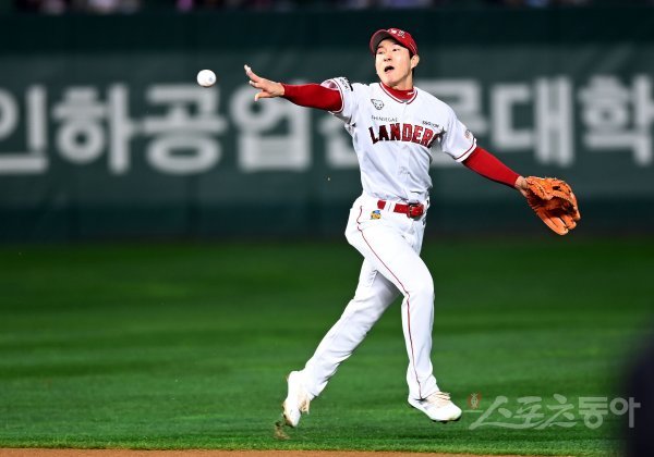 1일 인천 SSG 랜더스필드에서 ‘2022 신한은행 SOL KBO리그’ SSG 랜더스와 키움 히어로즈의 한국시리즈 1차전 경기가 열렸다. 4회초 1사 1루에서 SSG 박성한이 내야땅볼 타구를 잡아 2루로 송구하고 있다.
