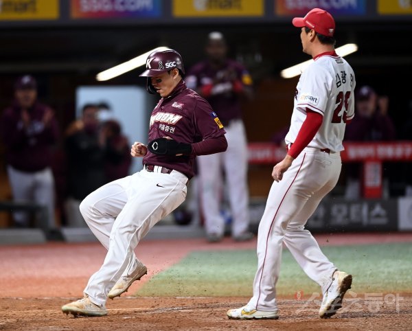 1일 인천 SSG 랜더스필드에서 ‘2022 신한은행 SOL KBO리그’ SSG 랜더스와 키움 히어로즈의 한국시리즈 1차전 경기가 열렸다. 5회초 2사 1, 3루에서 폭투 때 키움 3루 주자 송성문이 득점을 올리고 있다.