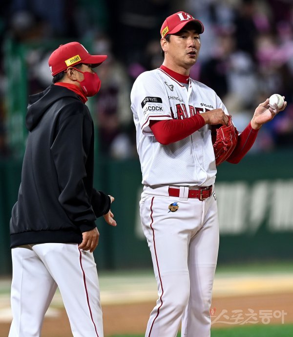 1일 인천 SSG 랜더스필드에서 ‘2022 신한은행 SOL KBO리그’ SSG 랜더스와 키움 히어로즈의 한국시리즈 1차전 경기가 열렸다. 6회초 2사 2루에서 역전을 허용한 SSG 선발 김광현이 교체되고 있다.