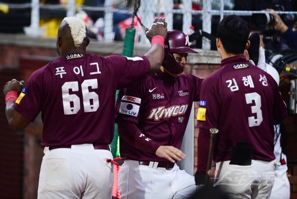 1일 인천 SSG랜더스필드에서 열린 ‘2022 신한은행 SOL KBO리그’ 한국시리즈 1차전 SSG 랜더스와 키움 히어로즈의 경기에서 5회초 2사 1, 3루 SSG의 폭투 때 키움 3루주자 송성문에 동점 득점에 성공한 후 더그아웃에서 동료들의 축하를 받고 있다.