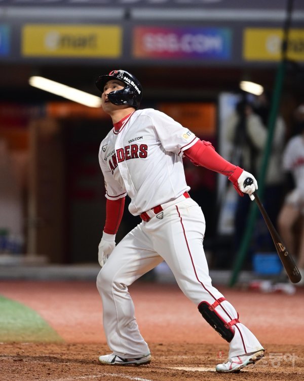 1일 인천 SSG랜더스필드에서 열린 ‘2022 신한은행 SOL KBO리그’ 한국시리즈 1차전 SSG 랜더스와 키움 히어로즈의 경기에서 5회말 2사 1루 SSG 최정이 1타점 좌전 2루타를 치고 있다.