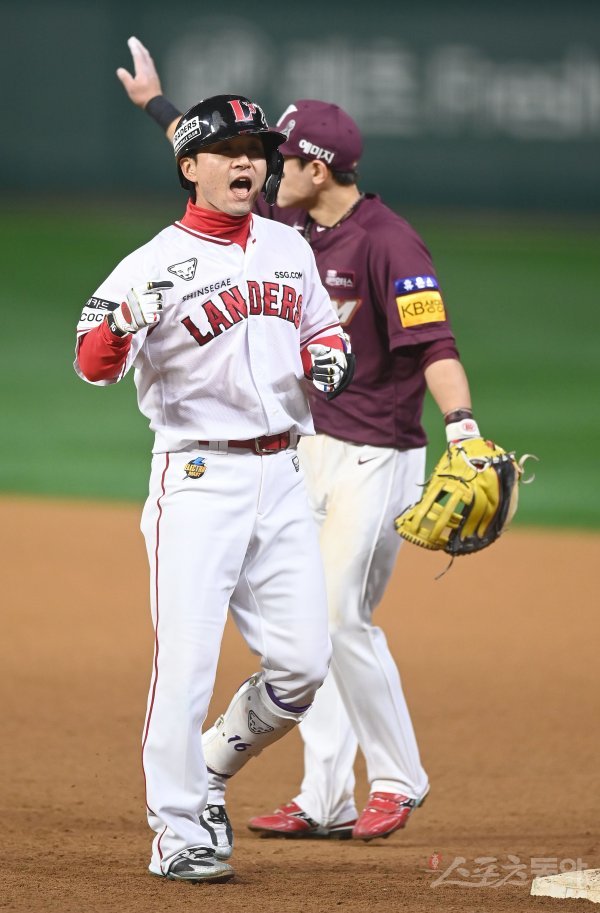 1일 인천 SSG랜더스필드에서 ‘2022 신한은행 MY CAR KBO리그’ 한국시리즈 1차전 키움 히어로즈와 SSG 랜더스 경기가 열렸다. 6회말 2사 3루 SSG 김성현이 동점을 만드는 적시타를 치고 1루에서 환호하고 있다.