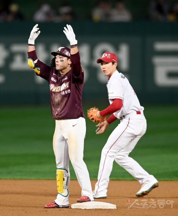 1일 인천 SSG랜더스필드에서 ‘2022 신한은행 MY CAR KBO리그’ 한국시리즈 1차전 키움 히어로즈와 SSG 랜더스 경기가 열렸다. 6회초 2사 1루 키움 김태진 다시 동점을 만드는 우전 2루타를 치고 2루에서 기뻐하고 있다.