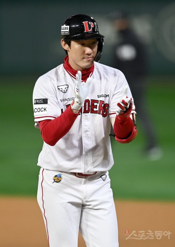 1일 인천 SSG랜더스필드에서 ‘2022 신한은행 MY CAR KBO리그’ 한국시리즈 1차전 키움 히어로즈와 SSG 랜더스 경기가 열렸다. 8회말 무사 2,3루 SSG 오태곤이 다시 앞서가는 1타점 희생타를 친 후 기뻐하고 있다.