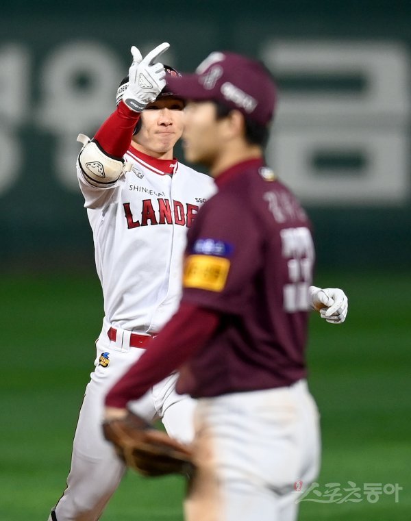 1일 인천 SSG랜더스필드에서 ‘2022 신한은행 MY CAR KBO리그’ 한국시리즈 1차전 키움 히어로즈와 SSG 랜더스 경기가 열렸다. 8회말 무사 1루 SSG 박성한이 우전 안타를 치고 2루에서 기뻐하고 있다.