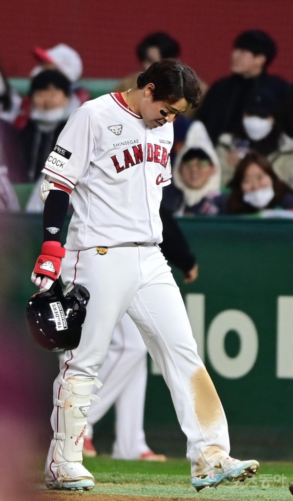 1일 인천 SSG랜더스필드에서 열린 ‘2022 신한은행 SOL KBO리그’ 한국시리즈 1차전 SSG 랜더스와 키움 히어로즈의 경기에서 7회말 1사 1, 2루 SSG 한유섬이 병살타를 친 후 아쉬워하고 있다.