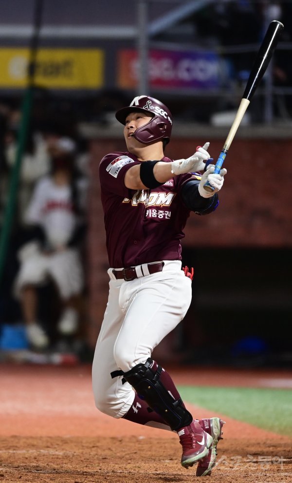 1일 인천 SSG랜더스필드에서 열린 ‘2022 신한은행 SOL KBO리그’ 한국시리즈 1차전 SSG 랜더스와 키움 히어로즈의 경기에서 9회초 1사 2루 키움 전병우가 역전 투런 홈런을 치고 있다.