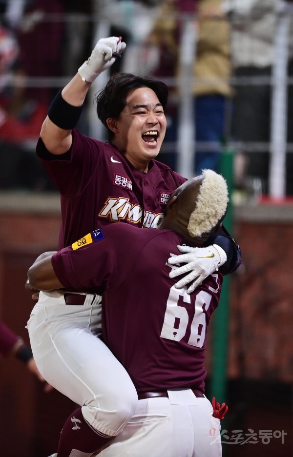 1일 인천 SSG랜더스필드에서 열린 ‘2022 신한은행 SOL KBO리그’ 한국시리즈 1차전 SSG 랜더스와 키움 히어로즈의 경기에서 9회초 1사 2루 키움 전병우가 역전 투런 홈런을 친 후 동료들과 기쁨을 나누고 있다.