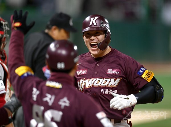 1일 인천 SSG랜더스필드에서 ‘2022 신한은행 MY CAR KBO리그’ 한국시리즈 1차전 키움 히어로즈와 SSG 랜더스 경기가 열렸다. 9회초 1사 2루 키움 전병우가 역전 좌월 투런 홈런을 날리그 그라운드를 돌아 홈인하며 환호하고 있다.