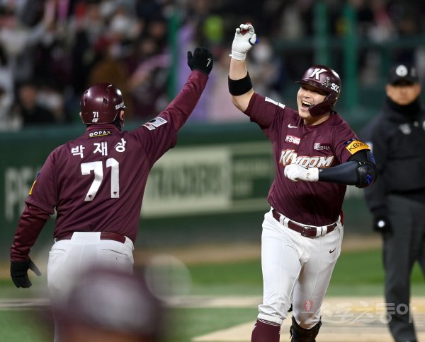 1일 인천 SSG랜더스필드에서 ‘2022 신한은행 MY CAR KBO리그’ 한국시리즈 1차전 키움 히어로즈와 SSG 랜더스 경기가 열렸다. 9회초 1사 2루 키움 전병우가 역전 좌월 투런 홈런을 날리그 그라운드를 돌아 홈인하며 환호하고 있다.