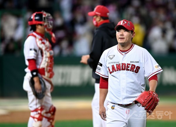 1일 인천 SSG 랜더스필드에서 ‘2022 신한은행 SOL KBO리그’ SSG 랜더스와 키움 히어로즈의 한국시리즈 1차전 경기가 열렸다. 9회초 1사 2루에서 역전 홈런을 허용한 SSG 노경은이 교체되고 있다.