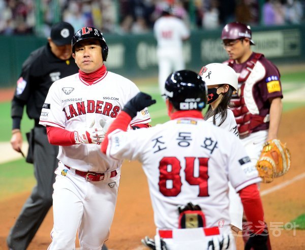 1일 인천 SSG랜더스필드에서 ‘2022 신한은행 MY CAR KBO리그’ 한국시리즈 1차전 키움 히어로즈와 SSG 랜더스 경기가 열렸다. 9회말 1사 SSG 김강민이 좌중월 솔로 홈런을 날리고 그라운드를 돌아 홈인해 하이파이브 하고 있다.