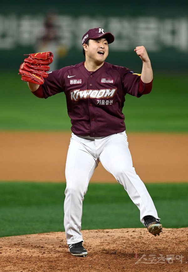 1일 인천 SSG랜더스필드에서 ‘2022 신한은행 MY CAR KBO리그’ 한국시리즈 1차전 키움 히어로즈와 SSG 랜더스 경기가 열렸다. 9회말 등판한 키움 김재웅이 첫 타자를 삼진 아웃시킨 후 환호하고 있다.