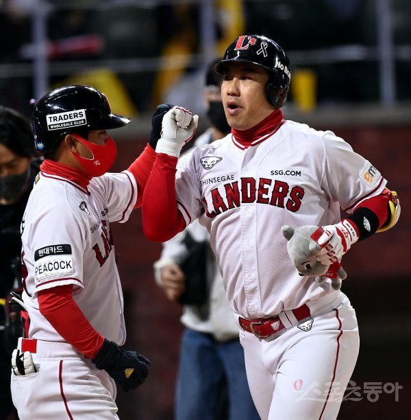 1일 인천 SSG 랜더스필드에서 ‘2022 신한은행 SOL KBO리그’ SSG 랜더스와 키움 히어로즈의 한국시리즈 1차전 경기가 열렸다. 9회말 1사에서 SSG 대타 김강민이 동점 솔로포를 쏘아 올린 후 코치의 환영을 받고 있다.