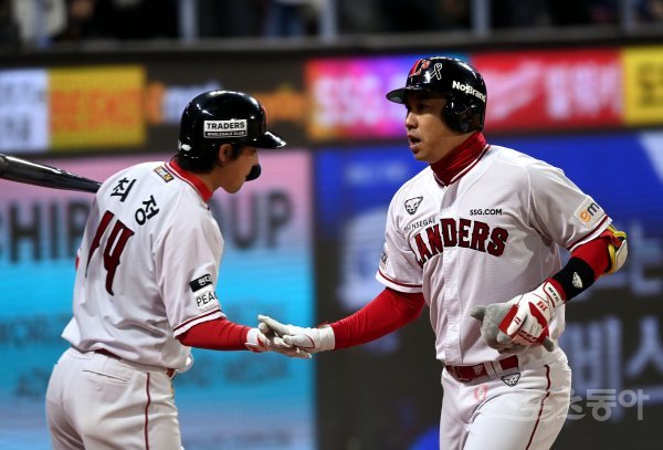 1일 인천 SSG 랜더스필드에서 ‘2022 신한은행 SOL KBO리그’ SSG 랜더스와 키움 히어로즈의 한국시리즈 1차전 경기가 열렸다. 9회말 1사에서 SSG 대타 김강민이 동점 솔로포를 쏘아 올린 후 최정의 환영을 받고 있다.