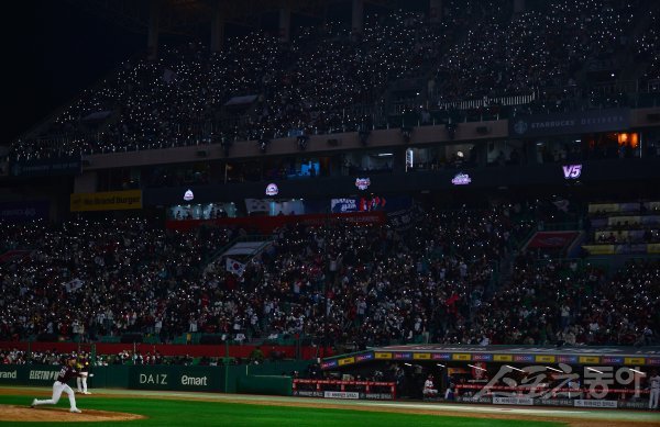 1일 인천 SSG랜더스필드에서 열린 ‘2022 신한은행 SOL KBO리그’ 한국시리즈 1차전 SSG 랜더스와 키움 히어로즈의 경기에서 만원 관중들이 플래시 응원을 하고 있다.