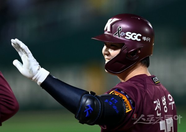 1일 인천 SSG 랜더스필드에서 ‘2022 신한은행 SOL KBO리그’ SSG 랜더스와 키움 히어로즈의 한국시리즈 1차전 경기가 열렸다. 연장 10회초 2사 1, 2루에서 키움 전병우가 1타점 적시타를 날린 후 환호하고 있다.