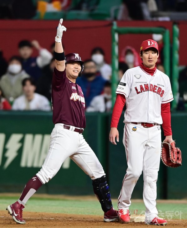 1일 인천 SSG랜더스필드에서 열린 ‘2022 신한은행 SOL KBO리그’ 한국시리즈 1차전 SSG 랜더스와 키움 히어로즈의 경기에서 연장 10회초 2사 1, 2루 키움 전병우가 1타점 좌전 적시타를 친 후 더그아웃을 향해 세리머니하고 있다.