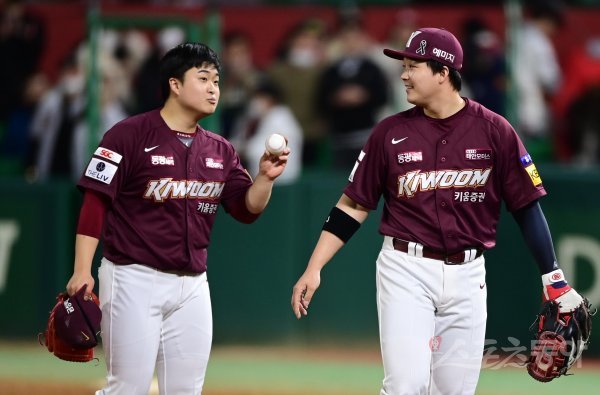 1일 인천 SSG랜더스필드에서 열린 ‘2022 신한은행 SOL KBO리그’ 한국시리즈 1차전 SSG 랜더스와 키움 히어로즈의 경기에서 7-6으로 승리한 키움 김재웅과 전병우가 승리 기념구를 들고 이야기하고 있다.