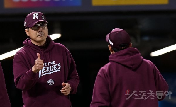 1일 인천 SSG 랜더스필드에서 ‘2022 신한은행 SOL KBO리그’ SSG 랜더스와 키움 히어로즈의 한국시리즈 1차전 경기가 열렸다. 연장끝에 키움이 SSG를 상대로 7-6으로 승리한 후 홍원기 감독이 선수들을 환영하고 있다.