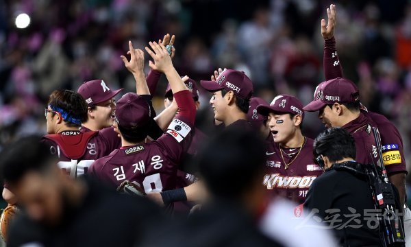 1일 인천 SSG 랜더스필드에서 ‘2022 신한은행 SOL KBO리그’ SSG 랜더스와 키움 히어로즈의 한국시리즈 1차전 경기가 열렸다. 연장끝에 키움이 SSG를 상대로 7-6으로 승리한 후 선수들이 그라운드에서 기쁨을 나누고 있다.
