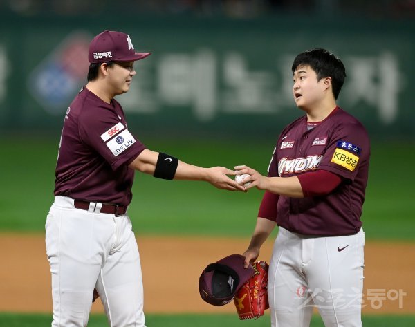 1일 인천 SSG랜더스필드에서 ‘2022 신한은행 MY CAR KBO리그’ 한국시리즈 1차전 키움 히어로즈와 SSG 랜더스 경기가 열렸다. 연장까지 가는 접전 끝에 키움이 7-6 역전승을 거뒀다. 경기 종료 후 키움 전병우가 김재웅에게 승리 기념구를 전달하고 있다.