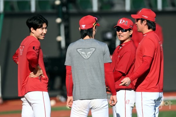 2일 인천 SSG 랜더스필드에서 ‘2022 신한은행 SOL KBO리그’ SSG 랜더스와 키움 히어로즈의 한국시리즈 2차전 경기가 열린다. 경기 전 SSG 선수들이 훈련도중 이야기를 나누고 있다.