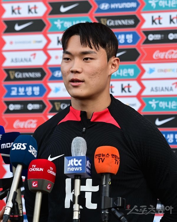 한국축구대표팀이 2일 경기도 파주 축구대표팀트레이닝센터(NFC)에서 2022 FIFA 카타르 월드컵 대비 아이슬란드와 마지막 국내 평가전에 앞서 소집훈련을 진행했다. 한국 오현규가 훈련에 앞서 취재진과 인터뷰를 하고 있다.