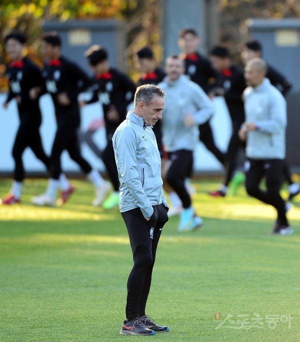 한국축구대표팀이 2일 경기도 파주 축구대표팀트레이닝센터(NFC)에서 2022 FIFA 카타르 월드컵 대비 아이슬란드와 마지막 국내 평가전에 앞서 소집훈련을 진행했다. 한국 파울루 벤투 감독이 생각에 잠겨 있다.