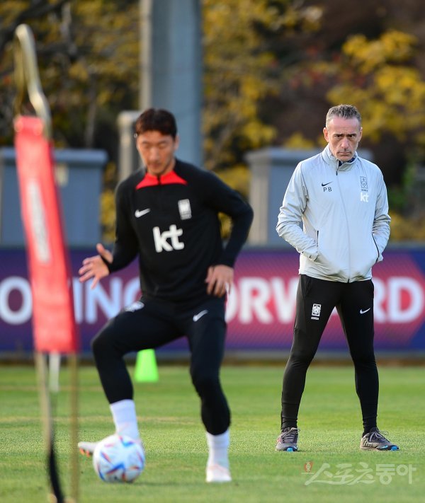 한국축구대표팀이 2일 경기도 파주 축구대표팀트레이닝센터(NFC)에서 2022 FIFA 카타르 월드컵 대비 아이슬란드와 마지막 국내 평가전에 앞서 소집훈련을 진행했다. 한국 파울루 벤투 감독이 선수들의 훈련을 지켜보고 있다.