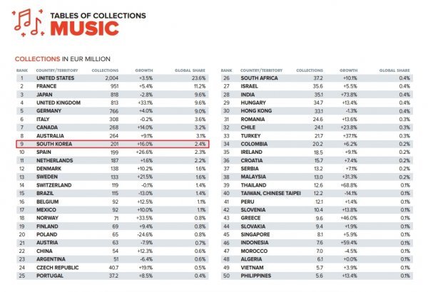 국내 최대 음악 저작권 단체 한국음악저작권협회(한음저협)가 지난해 음악 저작권료 징수 금액 기준 세계 9위에 올랐다. 2일 국제저작권관리단체연맹(CISAC)이 내놓은 2022 국제 징수 보고서에 따르면 한음저협은 2021년 음악 분야에서 전년 대비 16% 증가한 약 2억100만 유로(약 2818억 원)를 징수했다. 이는 7위 캐나다와 8위 호주에 이은 세계 9위 규모로 역대 최고 순위다. 1위와 2위는 각각 미국과 프랑스가 차지했다. 한음저협은 “세계적으로 큰 폭의 징수액 감소를 겪은 2020년과 달리 각국의 감염증 대응과 디지털 분야 성장 덕에 징수액이 증가세로 전환됐다”고 밝혔다.