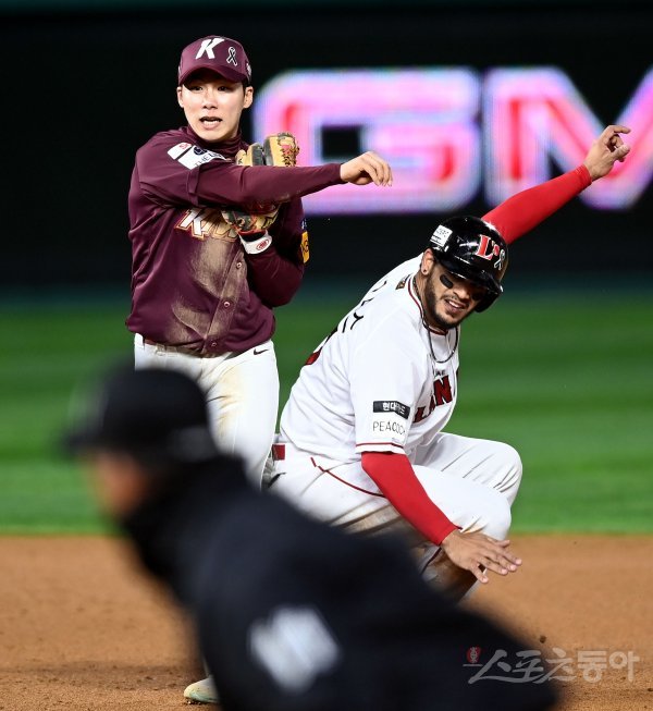 2일 인천 SSG 랜더스필드에서 ‘2022 신한은행 SOL KBO리그’ SSG 랜더스와 키움 히어로즈의 한국시리즈 2차전 경기가 열렸다. 1회말 1사 1, 3루에서 내야땅볼 때 키움 김혜성이 SSG 1루 주자 라가레스를 2루에서 포스 아웃시킨 후 1루로 송구하고 있다.