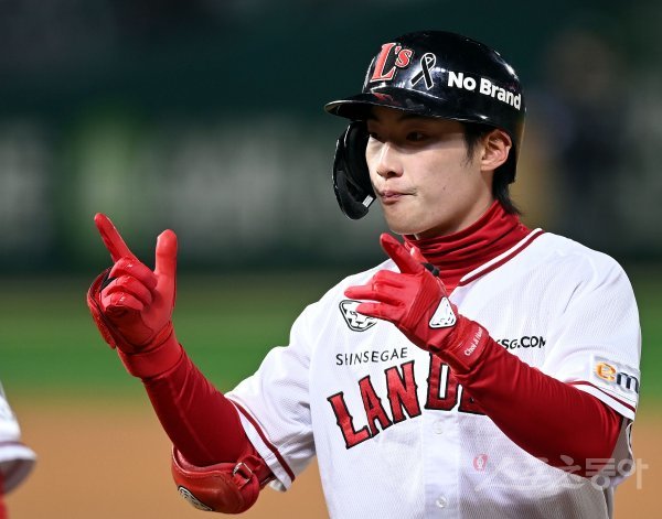 2일 인천 SSG 랜더스필드에서 ‘2022 신한은행 SOL KBO리그’ SSG 랜더스와 키움 히어로즈의 한국시리즈 2차전 경기가 열렸다. 1회말 무사 1루에서 SSG 최지훈이 안타를 날린 후 세리머니를 펼치고 있다.