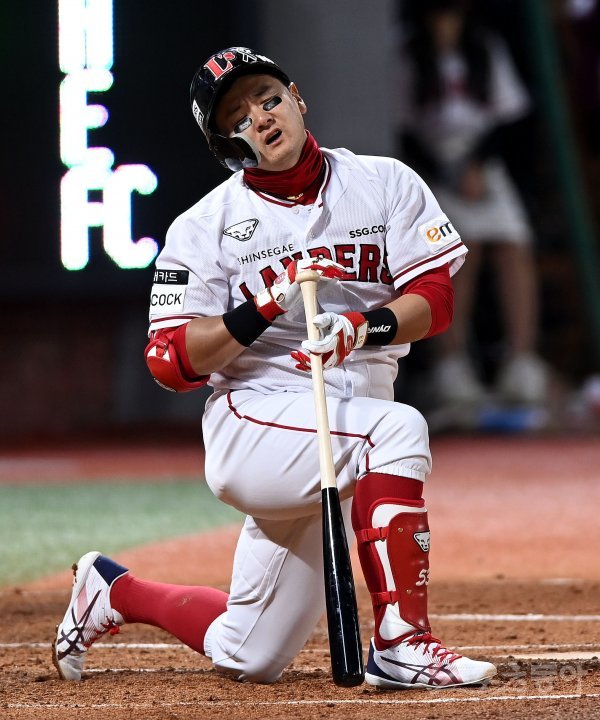 2일 인천 SSG 랜더스필드에서 ‘2022 신한은행 SOL KBO리그’ SSG 랜더스와 키움 히어로즈의 한국시리즈 2차전 경기가 열렸다. 1회말 2사 1루에서 SSG 최주환이 파울 홈런을 날린 후 아쉬워하고 있다.