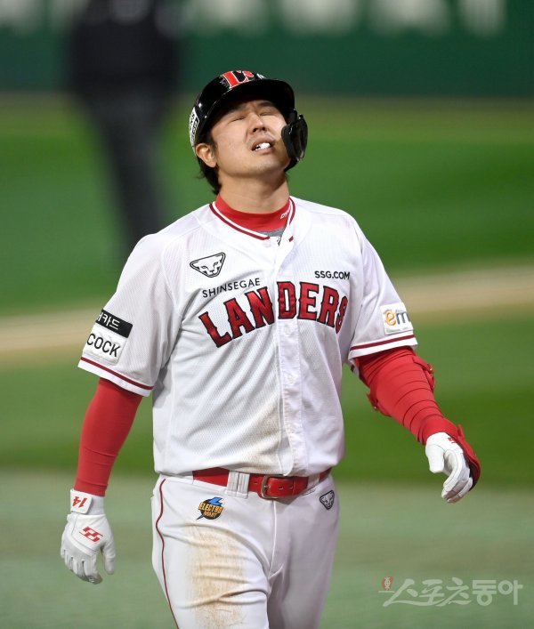 2일 인천 SSG랜더스필드에서 ‘2022 신한은행 MY CAR KBO리그’ 한국시리즈 2차전 키움 히어로즈와 SSG 랜더스 경기가 열렸다. 3회말 무사 1루 SSG 최정이 홈런성 외야 뜬공으로 아웃된 후 아쉬워하고 있다.