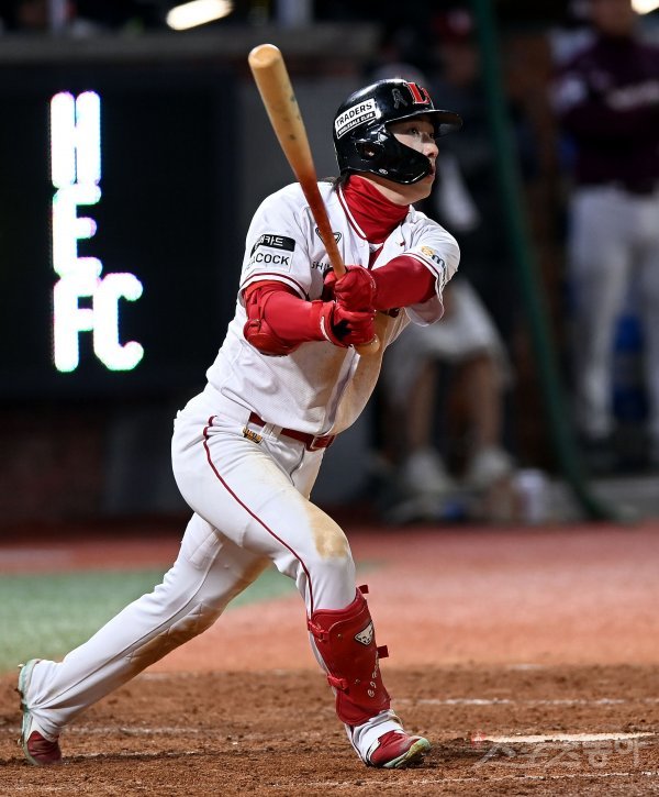 2일 인천 SSG 랜더스필드에서 ‘2022 신한은행 SOL KBO리그’ SSG 랜더스와 키움 히어로즈의 한국시리즈 2차전 경기가 열렸다. 5회말 1사 1루에서 SSG 최지훈이 투런 홈런을 쏘아 올리고 있다.