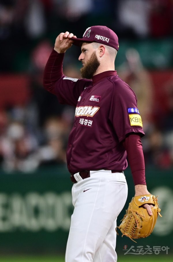 2일 인천 SSG랜더스필드에서 열린 ‘2022 신한은행 SOL KBO리그’ 한국시리즈 2차전 SSG 랜더스와 키움 히어로즈의 경기에서 5회말 1사 SSG에 안타를 허용한 키움 애플러가 모자를 고쳐쓰고 있다.