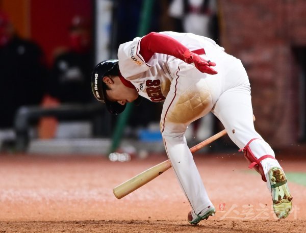 2일 인천 SSG랜더스필드에서 열린 ‘2022 신한은행 SOL KBO리그’ 한국시리즈 2차전 SSG 랜더스와 키움 히어로즈의 경기에서 5회말 2사 1루 SSG 최지훈이 스윙 후 중심을 잃고 있다.