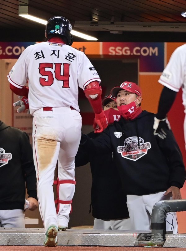 2일 인천 SSG랜더스필드에서 열린 ‘2022 신한은행 SOL KBO리그’ 한국시리즈 2차전 SSG 랜더스와 키움 히어로즈의 경기에서 5회말 2사 1루 SSG 최지훈이 좌월 투런 홈런을 친 후 더그아웃에서 김원형 감독의 축하를 받고 있다.