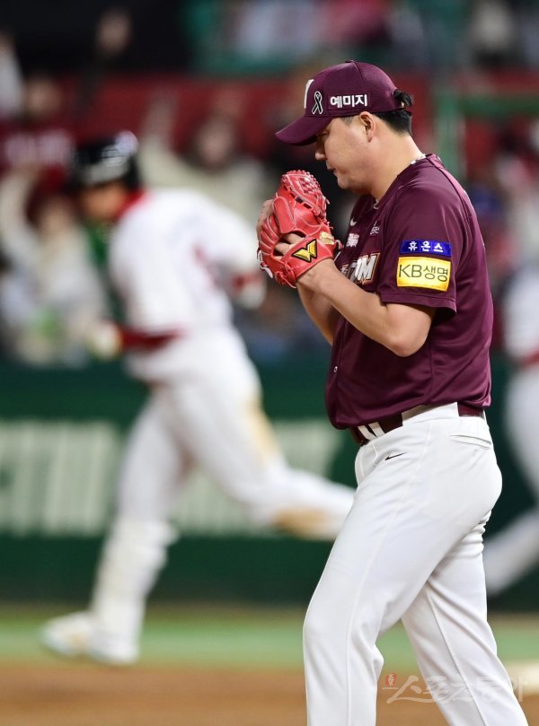 2일 인천 SSG랜더스필드에서 열린 ‘2022 신한은행 SOL KBO리그’ 한국시리즈 2차전 SSG 랜더스와 키움 히어로즈의 경기에서 7회말 1사 SSG에 솔로 홈런을 허용한 키움 김태훈이 아쉬워하고 있다.