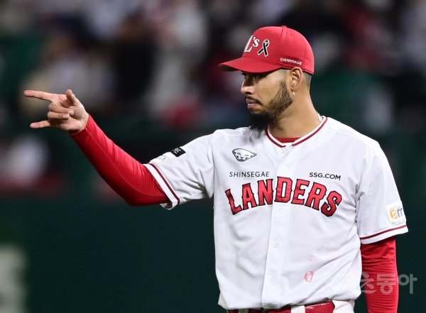 2일 인천 SSG랜더스필드에서 열린 ‘2022 신한은행 SOL KBO리그’ 한국시리즈 2차전 SSG 랜더스와 키움 히어로즈의 경기에서 7회초 1사 1루 SSG 폰트가 유격수에게 수신호를 보내고 있다.