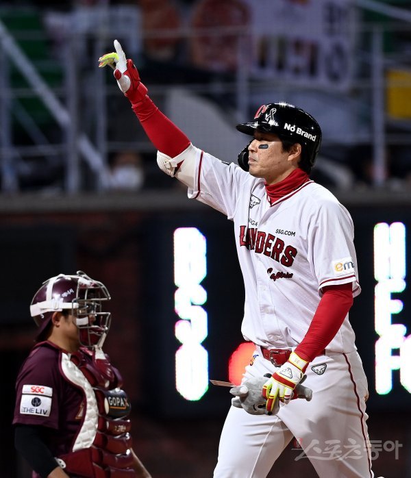 2일 인천 SSG 랜더스필드에서 ‘2022 신한은행 SOL KBO리그’ SSG 랜더스와 키움 히어로즈의 한국시리즈 2차전 경기가 열렸다. 7회말 1사에서 SSG 한유섬이 솔로 홈런을 쏘아 올린 후 세리머니를 펼치고 있다.