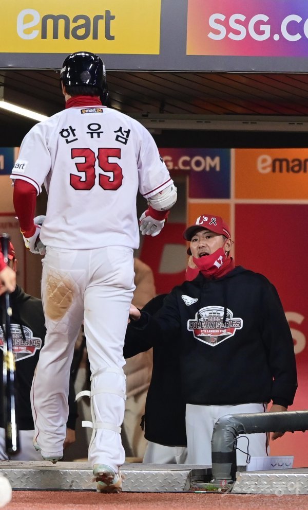 2일 인천 SSG랜더스필드에서 열린 ‘2022 신한은행 SOL KBO리그’ 한국시리즈 2차전 SSG 랜더스와 키움 히어로즈의 경기에서 7회말 1사 SSG 한유섬이 좌월 솔로 홈런을 친 후 더그아웃에서 김원형 감독의 축하를 받고 있다.