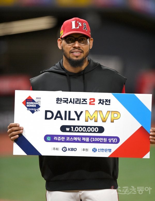 2일 인천 SSG랜더스필드에서 ‘2022 신한은행 MY CAR KBO리그’ 한국시리즈 2차전 키움 히어로즈와 SSG 랜더스 경기가 열렸다. 2차전 MVP에 선정된 SSG 폰트가 기념촬영을 하고 있다.