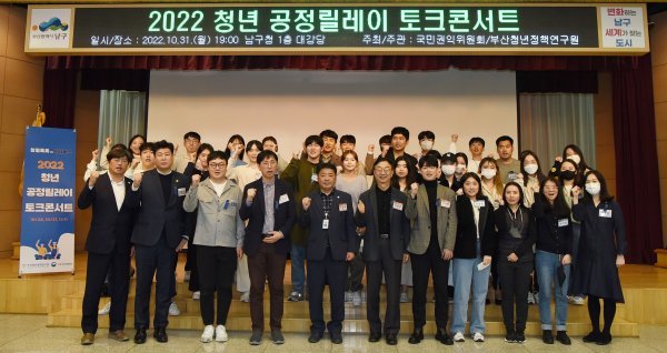 부산 남구(구청장 오은택)가 사단법인 부산청년정책연구원과 지난달 31일 남구청 대강당과 메타버스 가상공간에서 ‘2022년 청년 공정릴레이 토크콘서트’를 개최했다고 밝혔다.이날 행사는 공정을 주제로 진행됐으며 패널과 청년 등 100여명이 참여했다.